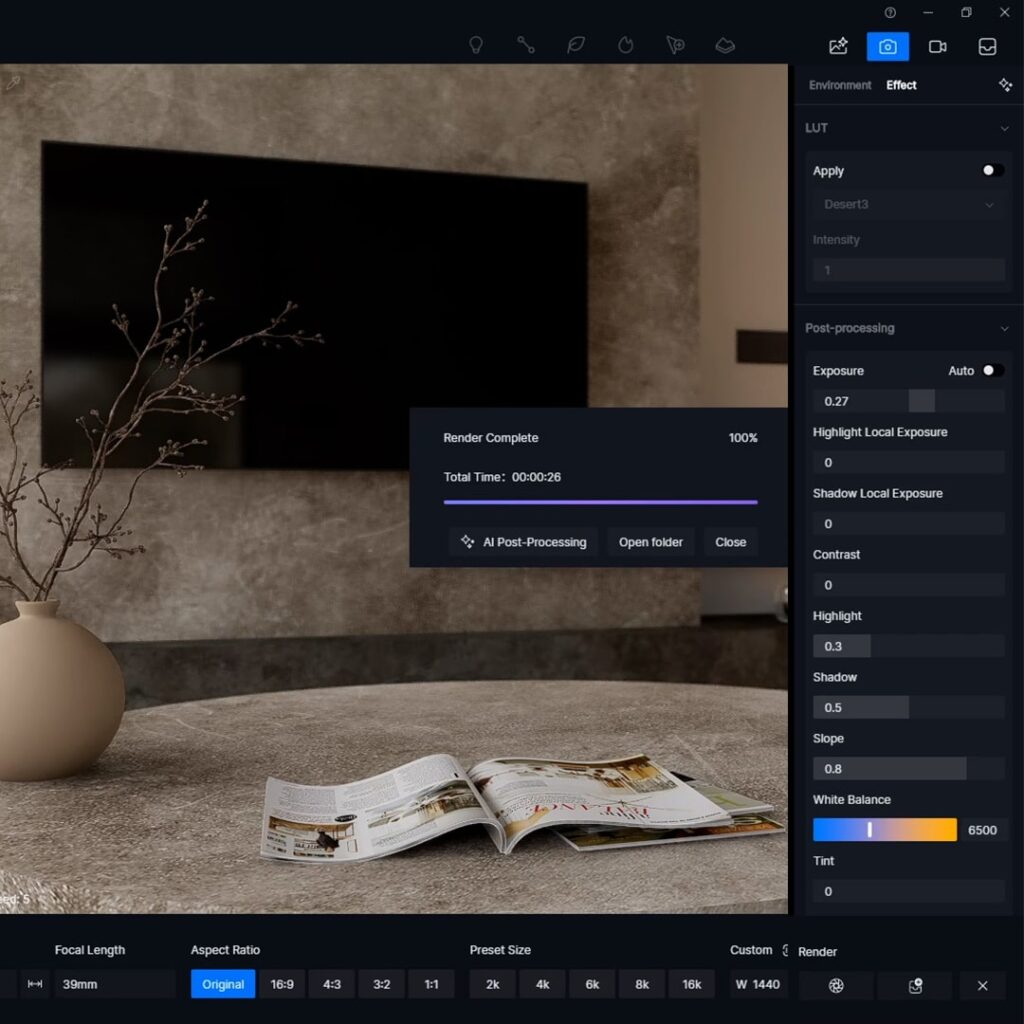 Na końcu ustawiamy rozdzielczość i proporcje wizualizacji, a potem przechodzimy do postprodukcji. Dzięki narzędziom AI możemy poprawić materiały i charakter wizualizacji. Dodatkowo dostosujemy kontrast, nasycenie, ekspozycję czy dodać winietę – wszystko po to, by wizualizacja wyglądała jeszcze lepiej.