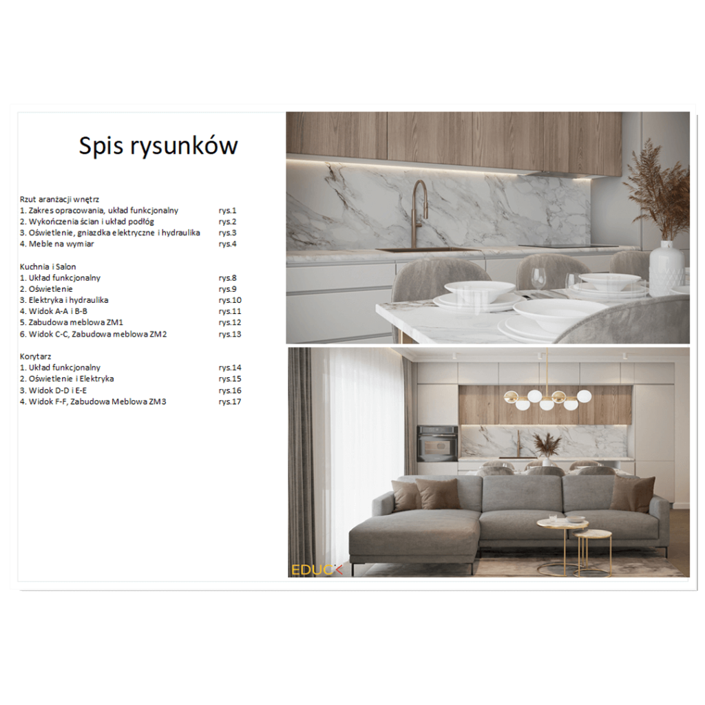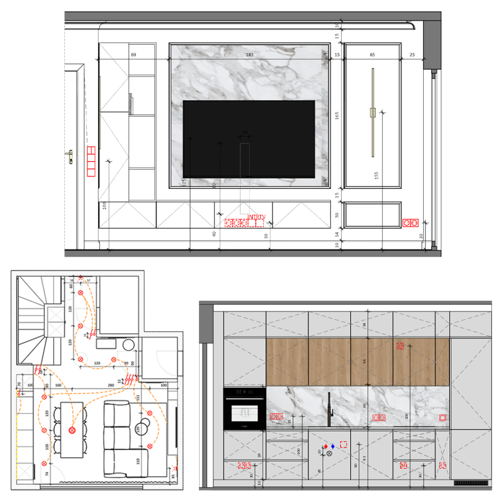 Stworzysz układy funkcjonalne, wykończenia ścian, układy podłóg, rzuty elektryki i hydrauliki, widoki ścian, perspektywy i rysunki mebli na wymiar. Wszystko w skali 1:20 oraz 1:50 wraz z symbolami, oznaczeniami, podpisami i wymiarami.