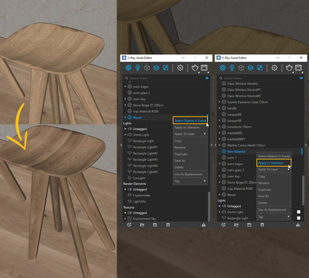 - Wybierz Obiekty w Scenie: Przejdź do Asset Editora w V-Ray Kliknij prawym przyciskiem myszy na obecny materiał, który znajduje się na hokerach. Wybierz “Select Objects in Scenę”, czyli wybierz obiekty w scenie.. To zaznaczy wszystkie powierzchnie używające tej tekstury.
